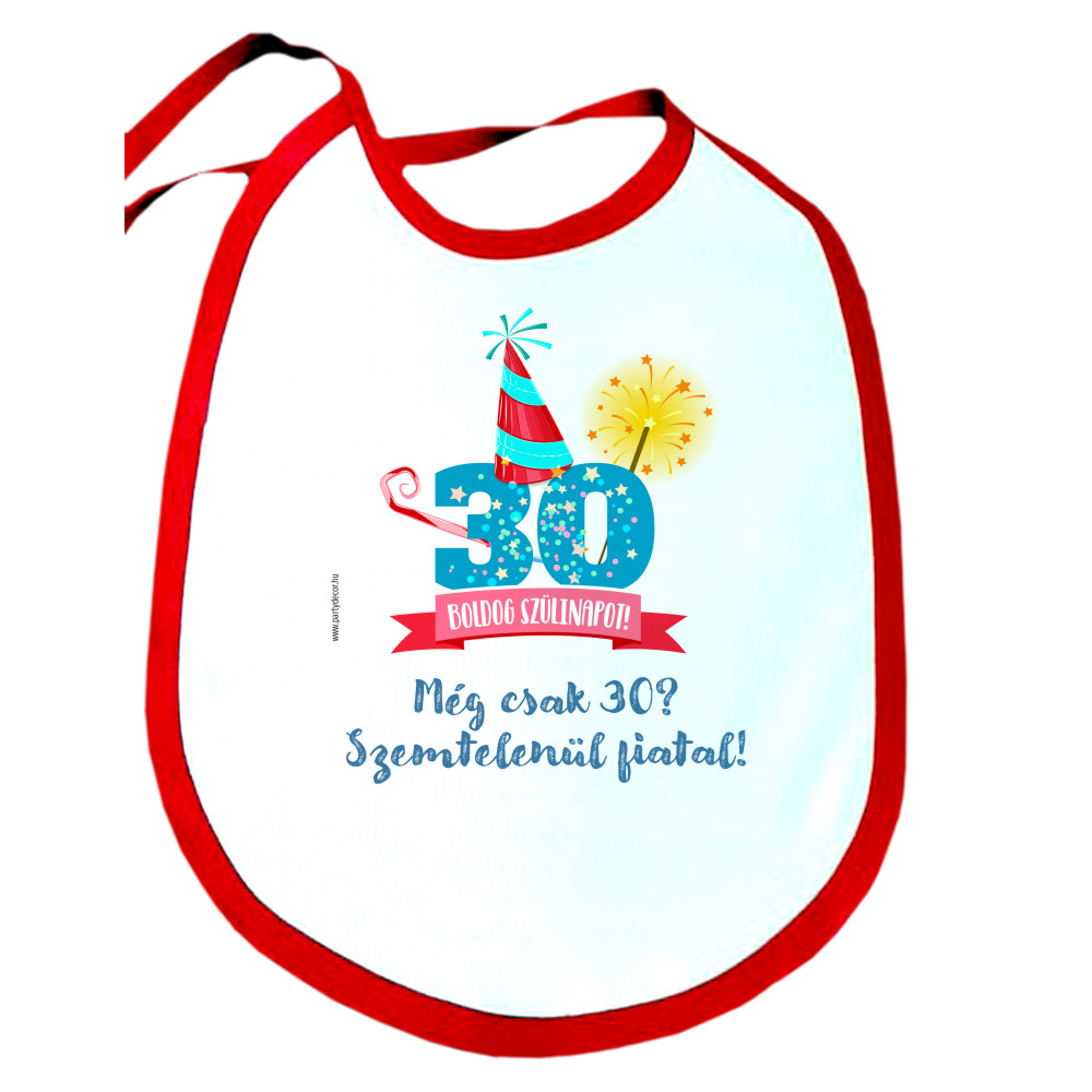 Születésnapi partedli 30-as számmal.A partedlin a felirat: Még csak 30? Szemtelenül fiatal!Méret: 25 cm x 35 cmAnyaga: 100% polyester
